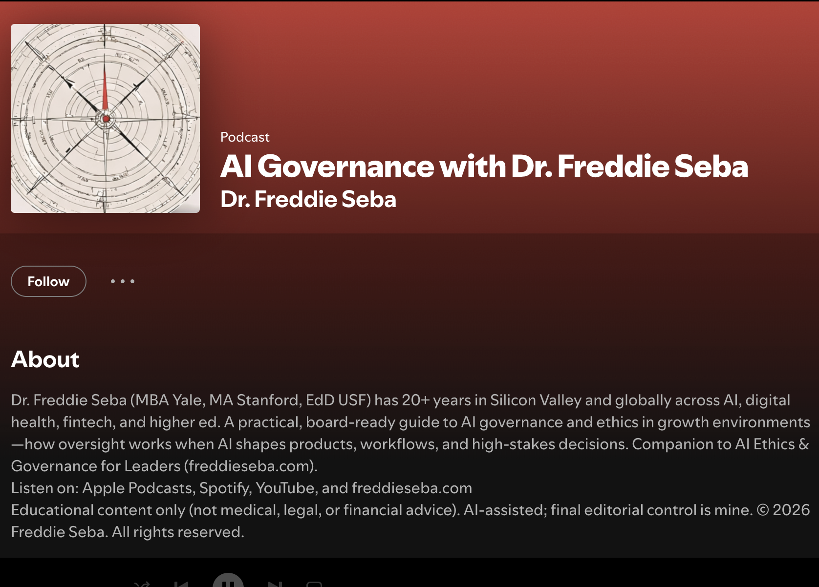 - Author, Podcast host and producer, AI Governance with Dr. Freddie Seba (YouTube, Substack, Apple Podcasts, Spotify)